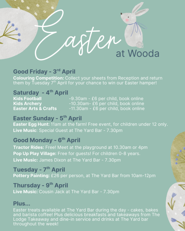 Join us at Wooda Farm Holidays for an unforgettable 2026 Easter Holiday in Bude! From our famous Easter Egg Hunts to delicious treats and live music, we’ve got something for everyone at Wooda.