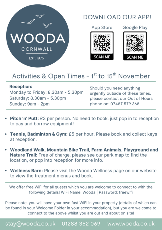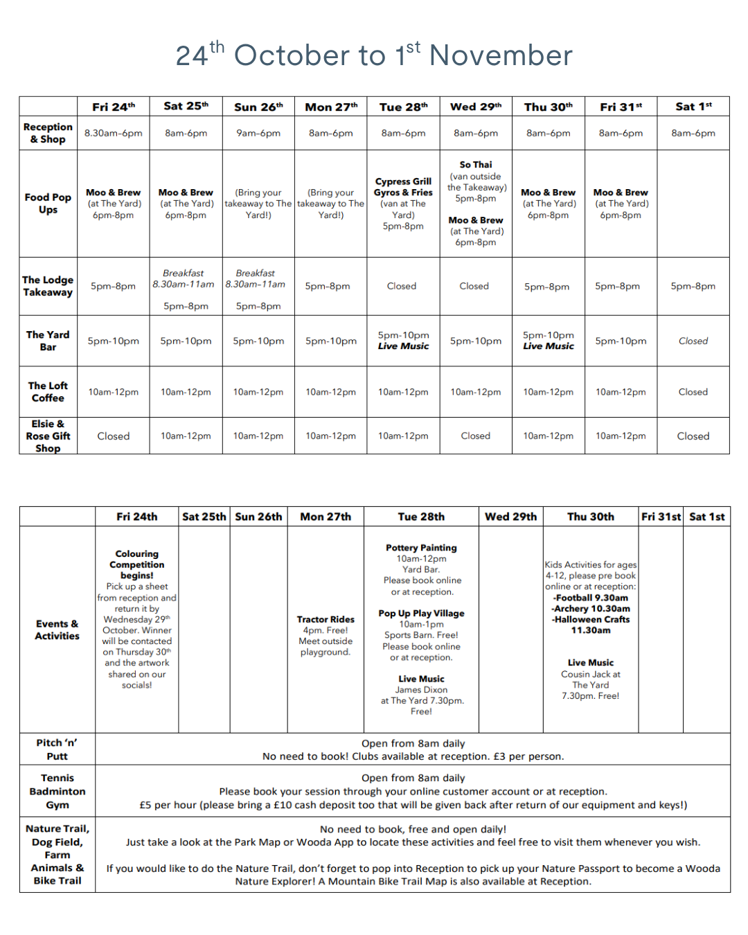 *Please note, as of the 1st November, all of our food and drink venues will be closed for Winter, so the open times sheets are limited to reception open hours and our year-round facilities.