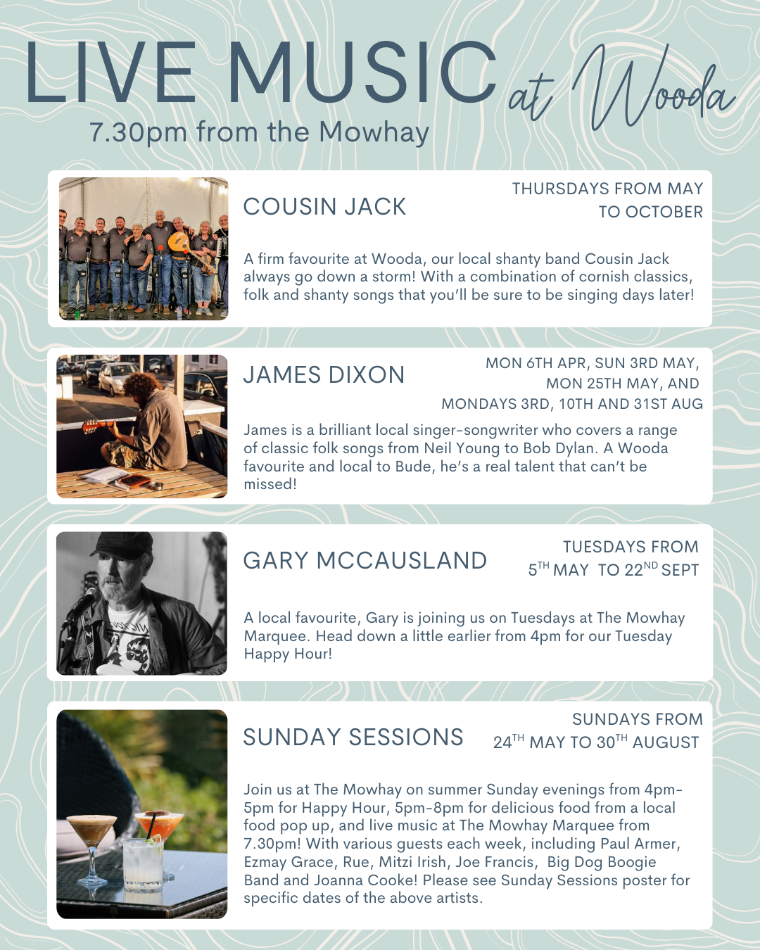 Our 2026 Live Music lineup is looking fantastic with live music on Sundays, Tuesdays and Thursdays throughout the season!