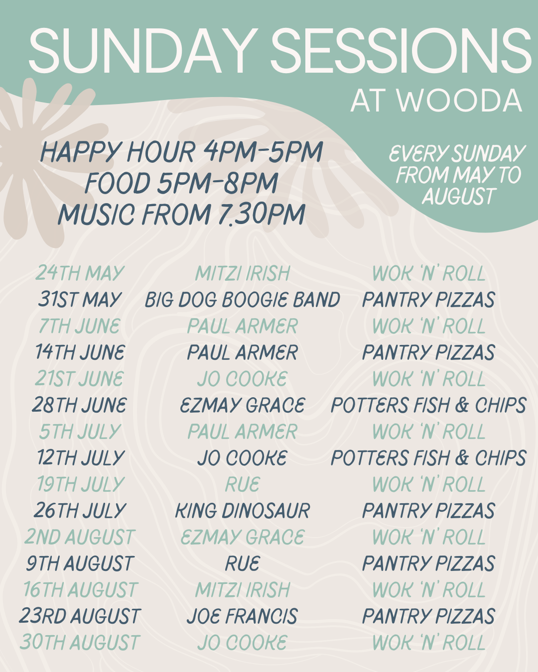 Sunday Sessions: Wok n Roll: 5pm-8pm 24th May, 7th June & 21st June, 5th & 19th July, 2nd, 16th & 30th August 2026 | Pantry Pizzas: 5pm-8pm 31st May, 14th June, 26th July, 9th & 23rd August 2026 | Potters Fish and Chips: 5pm-8pm 28th June and 12th July 2026